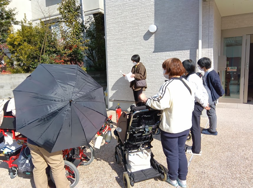 つむぎ奥のリハビリ台のコンセントからの出火という流れで、避難訓練をしました。